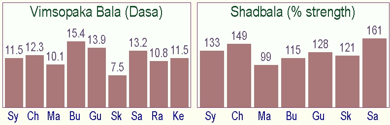VARGA-ÜBERSICHT 1: TIERKREISZEICHEN VARGA TEIL LAG SUR CHA MAN BUD GUR SHU SHA RAH KET LEBENSBEREICH --------------------------------------------------------------------- RASI 1 8 3 12 11 3 9 4 11 11 5 Basis-Chart HORA 1/2 Reichtum DREKKANA 1/3 4 7 12 3 3 9 4 7 3 9 Geschwister CHATHURTH. 1/4 5 9 12 5 3 9 4 8 2 8 Glücksfälle SAPTHAM. 1/7 8 7 7 3 3 10 10 5 1 7 Söhne/Enkel NAVAMSA 1/9 12 12 5 12 7 2 5 3 10 4 Ehepartner DASAMSA 1/10 1 9 10 5 3 10 1 8 2 8 Macht/Stellung DVADASAMSA 1/12 7 10 2 6 3 11 5 10 3 9 Eltern SHODASAMSA 1/16 7 6 12 3 9 11 3 8 10 10 Fahrzeuge VIMSAMSA 1/20 3 5 9 10 5 8 3 3 4 4 Religion SIDDHAMSA 1/24 2 7 8 8 5 9 7 3 1 1 Bildung/Wissen BHAMSA 1/27 11 11 3 12 7 5 1 8 4 10 Stärke TRIMSAMSA 1-5 1 3 3 3 1 10 2 2 9 9 Üble Einflüsse KHAVEDAMSA 1/40 8 1 3 3 1 7 12 2 3 3 Heil/Unheil AKSHAVEDA. 1/45 11 1 6 10 9 4 7 11 9 9 Allgemeines SHASHTIA. 1/60 4 4 12 2 4 7 12 7 8 2 Allgemeines VARGA-ÜBERSICHT 2: ZEICHENSTÄRKEN: VARGA TEIL LAG SUR CHA MAN BUD GUR SHU SHA RAH KET LEBENSBEREICH --------------------------------------------------------------------- RASI 1 8 12 8 16 18 6 16 16 10 Basis-Chart HORA 1/2 6 20 6 20 20 20 12 Reichtum DREKKANA 1/3 10 12 6 20 20 6 10 8 8 Geschwister CHATHURTH. 1/4 10 12 10 16 16 6 6 19 19 Glücksfälle SAPTHAM. 1/7 1 8 6 16 1 10 6 6 14 Söhne/Enkel NAVAMSA 1/9 10 14 14 14 6 10 10 10 6 Ehepartner DASAMSA 1/10 10 12 10 16 1 8 6 19 19 Macht/Stellung DVADASAMSA 1/12 6 19 6 16 12 10 16 8 8 Eltern SHODASAMSA 1/16 8 12 6 8 12 14 6 10 6 Fahrzeuge VIMSAMSA 1/20 16 12 19 10 14 14 10 10 6 Religion SIDDHAMSA 1/24 1 1 16 10 16 16 10 6 10 Bildung/Wissen BHAMSA 1/27 6 14 14 14 10 8 6 10 6 Stärke TRIMSAMSA 1-5 8 14 6 8 12 20 10 14 8 Üble Einflüsse KHAVEDAMSA 1/40 19 14 6 8 6 19 10 8 12 Heil/Unheil AKSHAVEDA. 1/45 19 14 19 8 19 16 16 14 8 Allgemeines SHASHTIA. 1/60 14 12 8 10 6 19 19 1 1 Allgemeines VARGA-ÜBERSICHT 3: REDUZIERTE ZEICHENSTÄRKEN: VARGA TEIL LAG SUR CHA MAN BUD GUR SHU SHA RAH KET LEBENSBEREICH --------------------------------------------------------------------- RASI 1 1 1 1 4 5 0 0 8 5 Basis-Chart HORA 1/2 5 12 4 19 13 15 1 Reichtum DREKKANA 1/3 1 5 0 19 10 4 2 7 7 Geschwister CHATHURTH. 1/4 5 2 4 15 5 3 1 11 11 Glücksfälle SAPTHAM. 1/7 1 5 3 14 1 1 3 3 7 Söhne/Enkel NAVAMSA 1/9 4 3 2 12 3 8 5 8 5 Ehepartner DASAMSA 1/10 8 12 5 13 0 5 4 8 8 Macht/Stellung DVADASAMSA 1/12 3 11 1 13 11 4 12 6 6 Eltern SHODASAMSA 1/16 0 9 3 6 3 12 6 3 2 Fahrzeuge VIMSAMSA 1/20 8 11 18 6 8 4 2 9 5 Religion SIDDHAMSA 1/24 0 0 7 6 14 13 5 3 5 Bildung/Wissen BHAMSA 1/27 1 8 5 7 3 3 4 4 2 Stärke TRIMSAMSA 1-5 1 1 1 2 6 0 0 14 8 Üble Einflüsse KHAVEDAMSA 1/40 0 13 5 2 0 11 4 6 9 Heil/Unheil AKSHAVEDA. 1/45 17 13 11 2 4 15 12 13 8 Allgemeines SHASHTIA. 1/60 8 10 6 9 4 17 12 1 1 Allgemeines DIE VARGAS IM DETAIL: RASHI * * * * * * * * * * * * * * * * * * * * * * * * * * * * * * Guru * * * * * * * * * * * * * * * * * * 9 * * 7 * * * 10 * * 6 * * * * * * * * * * * * * * * * 8 * * * * * Rahu * * * * * * Mangala 11 * 5 Ketu * * * * Shani * * * * * * * 2 * * * * * * * * * * * * * * * VARGA 1 *Chandra 12 * * 4 Shukra * * * 1 * * 3 * * RASI * * * * * * * * * * Buddha * * (1) * * * * Surya * * * * * * * Basis-Chart * * * * * * * * * * * * * * * * * * * * * * * DREKKANA UND CHATHURTHAMSA * * * * * * * * * * * * * * * * * * * * * * * * * * Rahu * * * * * * Mangala * * * * * * Buddha * * * * * * * * * * 5 * * 3 * * * 6 * Shukra * 2 * * * * * * * * * * * * * * * * 4 * * * * * * * * * * * Surya 7 * 1 * * * * Shani * * * * * * * 10 * * * * * * * * * * * * * * * VARGA 3 * 8 * * 12 Chandra* * * 9 * * 11 * DREKKANA * * * * * * * * Ketu * * * * (1/3) * * Guru * * * * * * * * * Geschwister * * * * * * * * * * * * * * * * * * * * * * * * * * * * * * * * * * * * * * * * * * * * * * * * * * * * * * * Shukra * * * * * * * * * * * * * * * * 6 * * 4 * * * 7 * Mangala * 3 Buddha * * * * * * * * * * * * * * * * 5 * * * * * * * * * * * Shani 8 * 2 Rahu * * * * Ketu * * * * * * * 11 * * * * * * * * * * * * * * * VARGA 4 *Surya 9 * * 1 * *Guru * 10 * 12 * CHATHURTH. * * * * * * * * * * * * (1/4) * * * * Chandra * * * * * * * Glücksfälle * * * * * * * * * * * * * * * * * * * * * * * DREKKANA (1/3) CHATHURTH. (1/4) Geschwister Glücksfälle GRAHA NR ZE STR STR DEVA/HERR GRAHA NR ZE STR STR DEVA/HERR Surya 2 7 10 1 Agasthya Surya 3 9 10 5 Kumara Chandra 1 12 12 5 Narada Chandra 1 12 12 2 Sanaka Mangala 2 3 6 0 Agasthya Mangala 3 5 10 4 Kumara Buddha 1 3 20 19 Narada Buddha 1 3 16 15 Sanaka Guru 1 9 20 10 Narada Guru 1 9 16 5 Sanaka Shukra 1 4 6 4 Narada Shukra 1 4 6 3 Sanaka Shani 3 7 10 2 Durvasa Shani 4 8 6 1 Sanatana Rahu 2 3 8 7 Agasthya Rahu 2 2 19 11 Sananda Ketu 2 9 8 7 Agasthya Ketu 2 8 19 11 Sananda Lagna 3 4 Durvasa Lagna 4 5 Sanatana SAPTHAMSA UND NAVAMSA * * * * * * * * * * * * * * * * * * * * * * * * * * Ketu * * * * * * Surya * * * * * * Chandra * * * * * * * * * * 9 * * 7 * * *Guru 10 * * 6 * *Shukra * * * * * * * * * * * * * * 8 * * * * * * * * * * * 11 * 5 Shani * * * * * * * * * * * 2 * * * * * * * * * * * * * * * VARGA 5 * 12 * * 4 * * * 1 * * 3 * * SAPTHAM. * * * * * * * * * * Buddha * * (1/7) * * Rahu * * Mangala * * * * * * * Söhne/Enkel * * * * * * * * * * * * * * * * * * * * * * * * * * * * * * * * * * * * * * * * * * * * * * * * * * * * * * * * * * * * * * * * * * * * * * * 1 * * 11 * *Guru 2 * Surya * 10 Rahu * * * * Mangala * * * * * * * * * * * * 12 * * * * * * * * * * * Shani 3 * 9 * * * * * * * * * * * 6 * * * * * * * * * * * * * * * VARGA 6 *Ketu 4 * * 8 * * * 5 * * 7 * * NAVAMSA * * * * * * * * Shukra * * * * (1/9) * * Chandra * * Buddha * * * * * * * Ehepartner * * * * * * * * * * * * * * * * * * * * * * * SAPTHAM. (1/7) NAVAMSA (1/9) Söhne/Enkel Ehepartner GRAHA NR ZE STR STR DEVA/HERR GRAHA NR ZE STR STR DEVA/HERR Surya 5 7 1 1 Ikshu Rasa Surya 6 12 10 4 Deva Chandra 2 7 8 5 Madhya Chandra 2 5 14 3 Manushya Mangala 5 3 6 3 Ikshu Rasa Mangala 6 12 14 2 Deva Buddha 1 3 16 14 Kshara Buddha 1 7 14 12 Rakshasa Guru 2 10 1 1 Kshera Guru 2 2 6 3 Manushya Shukra 1 10 